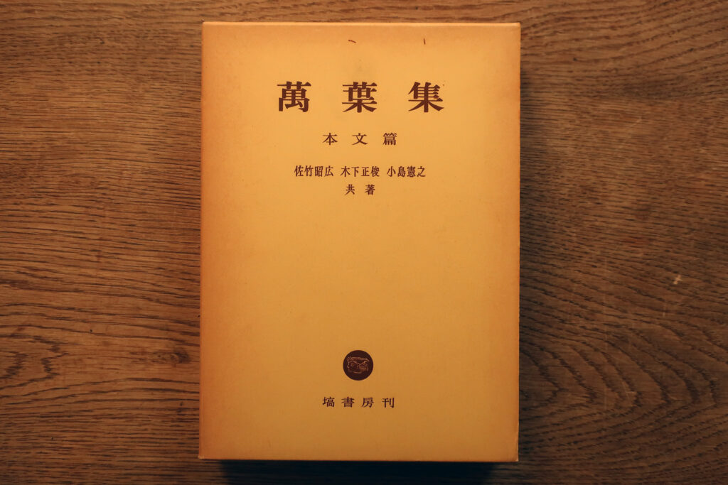 塙書房『萬葉集 本文篇』(佐竹昭広・木下正俊・小島憲之 校訂)。上記小学館の日本古典全集本は原文も載せるが、その校注者が校訂した『万葉集』本文。「西本願寺本」を底本とし、諸本により校勘して、総ふりがなで読みを示す。1冊本で使用しやすいこともあり、『万葉集』の本文(漢字)を見るのに広く用ゐられる。下の写真は、小生が大学の授業(40年以上前)で使用したもの。現在は新出資料の内容を盛り込んだ「補訂版」が刊行されてゐる。漢字交じり平仮名に書き下した『萬葉集 訳文篇』もある。