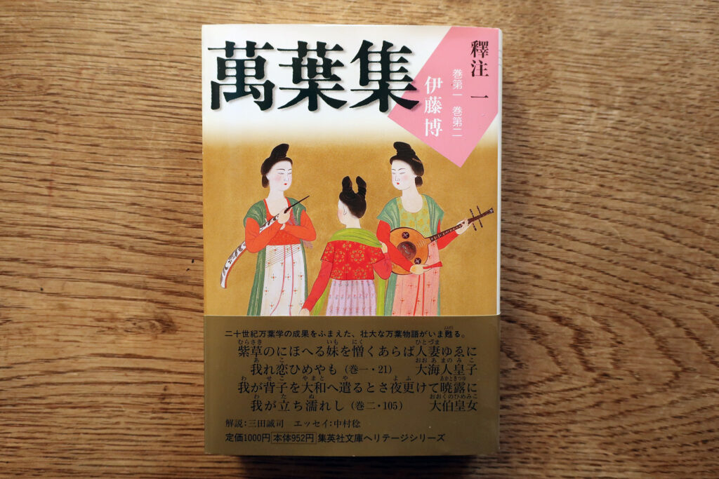 集英社文庫ヘリテージシリーズ『萬葉集 釋注』(伊藤博 訳注)。『萬葉集釋注』(集英社)を基に再構成して、文庫化したもの。本文(書き下し文)を掲げ、続けて釈文(歌群に対する考察)を載せる。原文は原則割愛。(一部、必要な場合は本文の後に掲げる。)現代語訳は、釈文の中に掲げ、原文を尊重しながら必要に応じて言葉を補つてゐる。巻末に補注を付し、さらに解説・エッセイ・初句索引を置く。最大の特徴は、万葉歌は、歌群として味はふことで真価を表す場合が少なくないとし、歌群ごとに本文を提示し、注解を加へた点である。