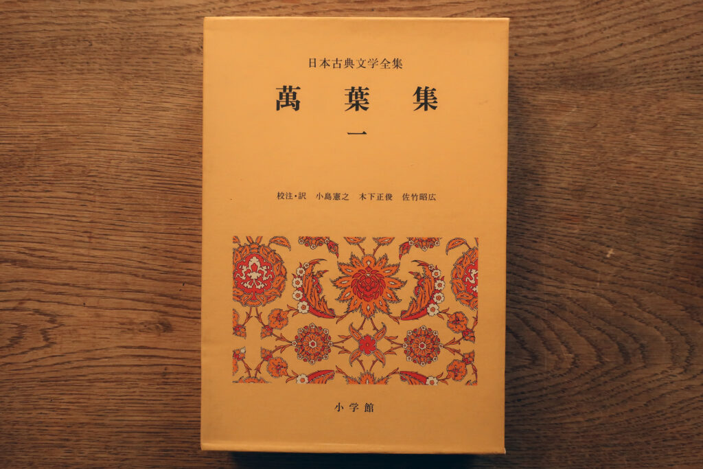 小学館の日本古典文学全集『萬葉集』(小島憲之・木下正俊・佐竹昭広 訳注)。3段組で、中央に読み下し本文を置き、下段に原文と口語訳、上段に注解を載せる。口語訳は、原文に忠実で、句間にスペースを置き原文と対照させやすくしてゐる。(枕詞は括弧の中に入れて記す。)注解も丁寧である。巻末に校訂付記・解説・年表・人名一覧・地名一覧・系図・地図・初句索引を付す。