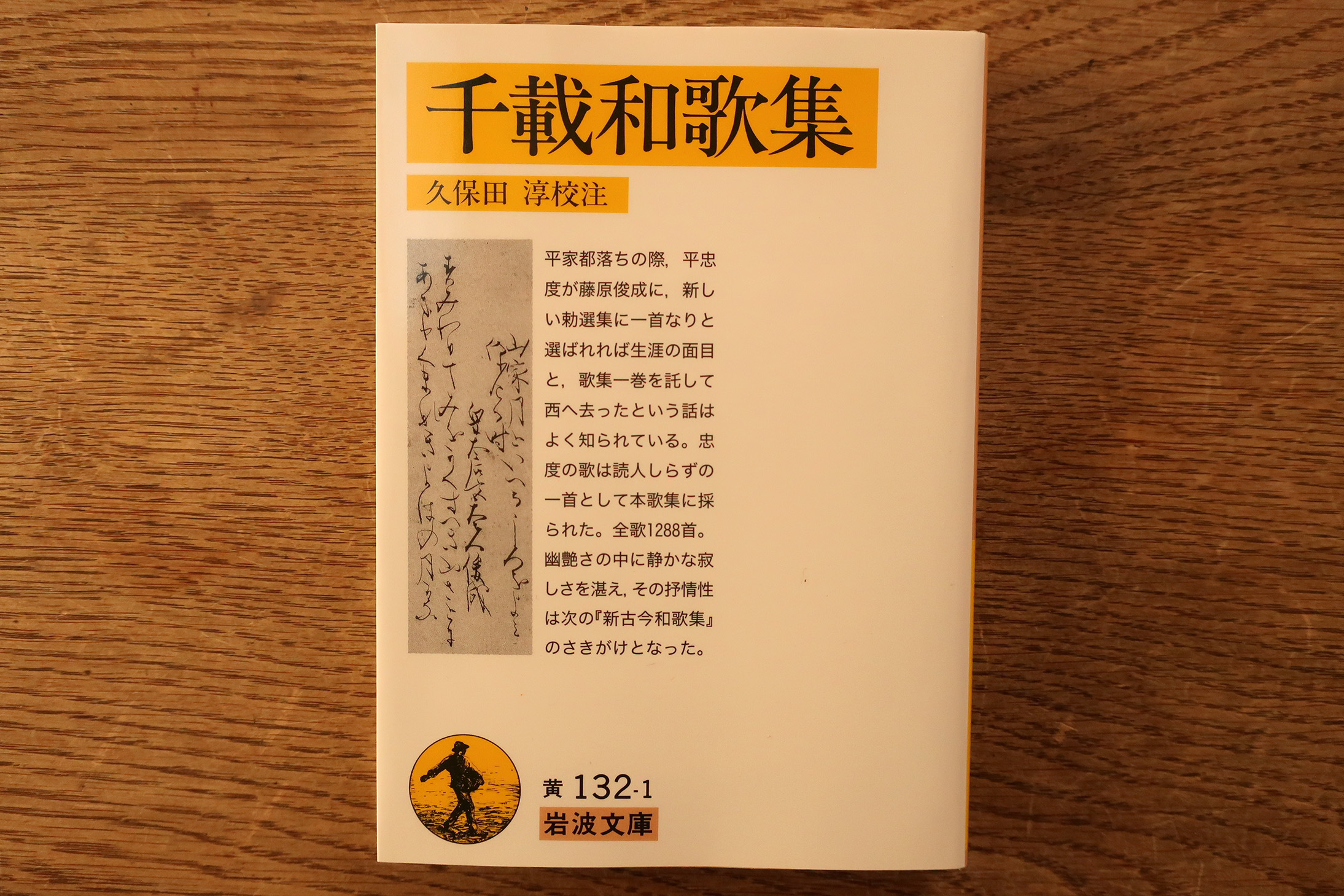 小生は、随分前に岩波文庫『千載和歌集』(久保田淳 校注)で読んだ。近年の岩波文庫『拾遺和歌集』『後拾遺和歌集』『金葉和歌集』『詞花和歌集』などは、見開きで右ページに本文・左ページに注を置き、注にかなりのスペースを割いてゐるが、これは1986年刊行で、脚注形式である。注の内容は、語釈・大意・参考となる詩歌や本説や本文の異同であるが、スペースの関係で注は簡素である。歌全体の大意があるものは少ない。巻末に、補注・解説・和歌索引・作者索引を付す。(アイキャッチ画像は、現行のミラーコート紙カバーのもの。下の写真は、小生が読んだパラフィン紙カバー時代のもの。)