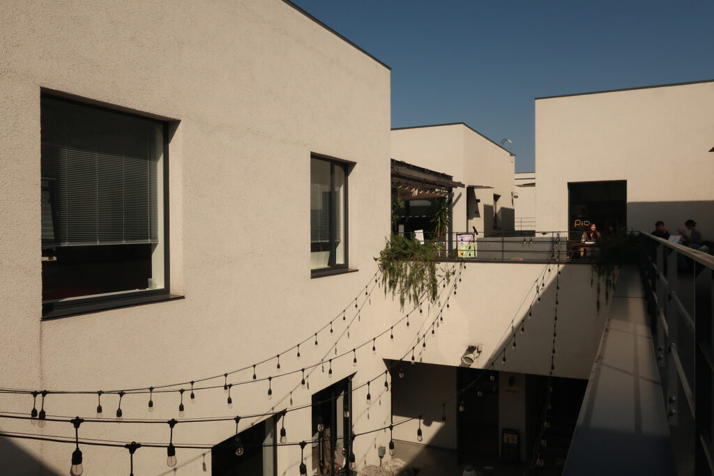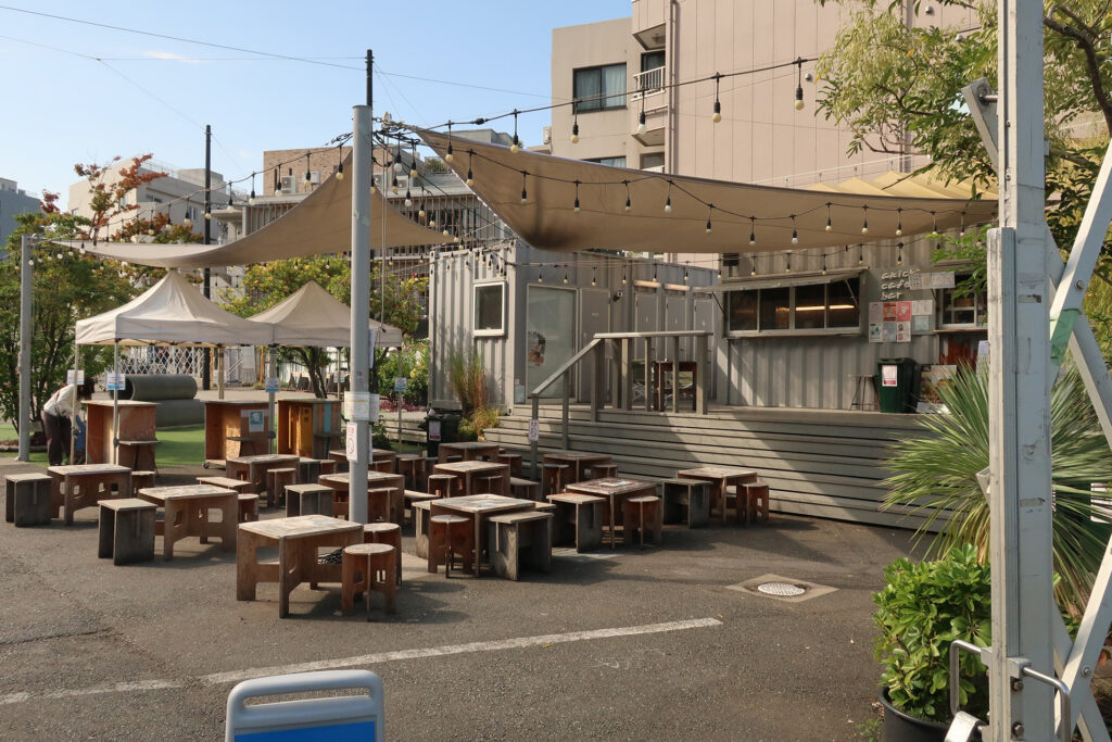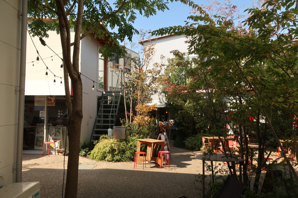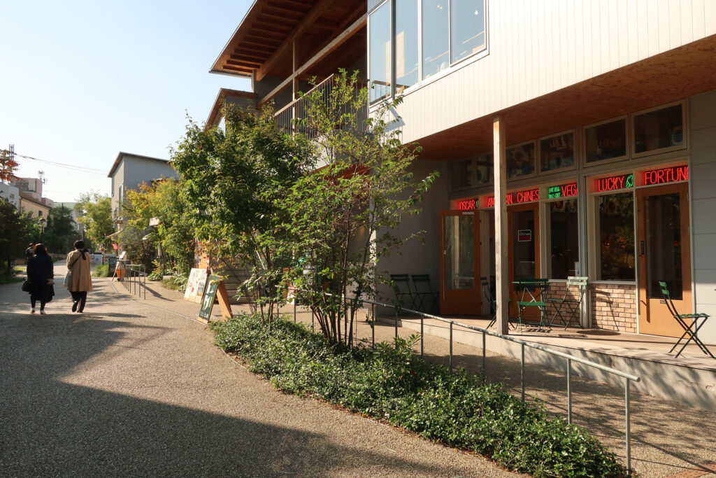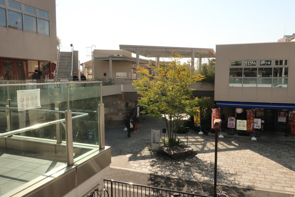 店舗の背後に広場があり、その周囲にも施設がある。週末にはイベントが行はれることもある。