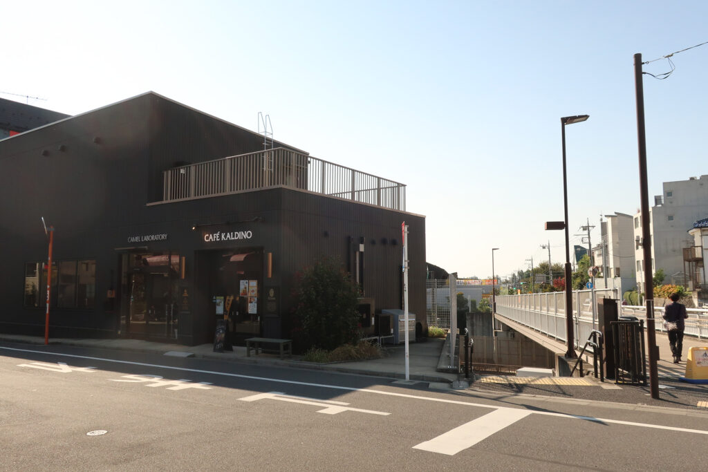 東京都道318号環状七号線(環七通り)に架かる「代田富士見橋」とその袂の「CAFE KALDINO」。