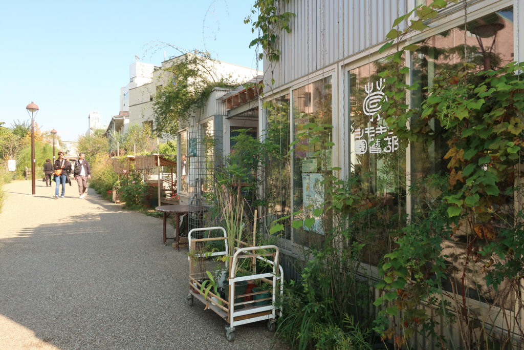 「下北線路街」の側の緑の成長を見守り手を入れ育む「シモキタ園藝部」。遊歩道にある「ChaYa」では、ワイルドティや天然蜂蜜などを売つてゐる。