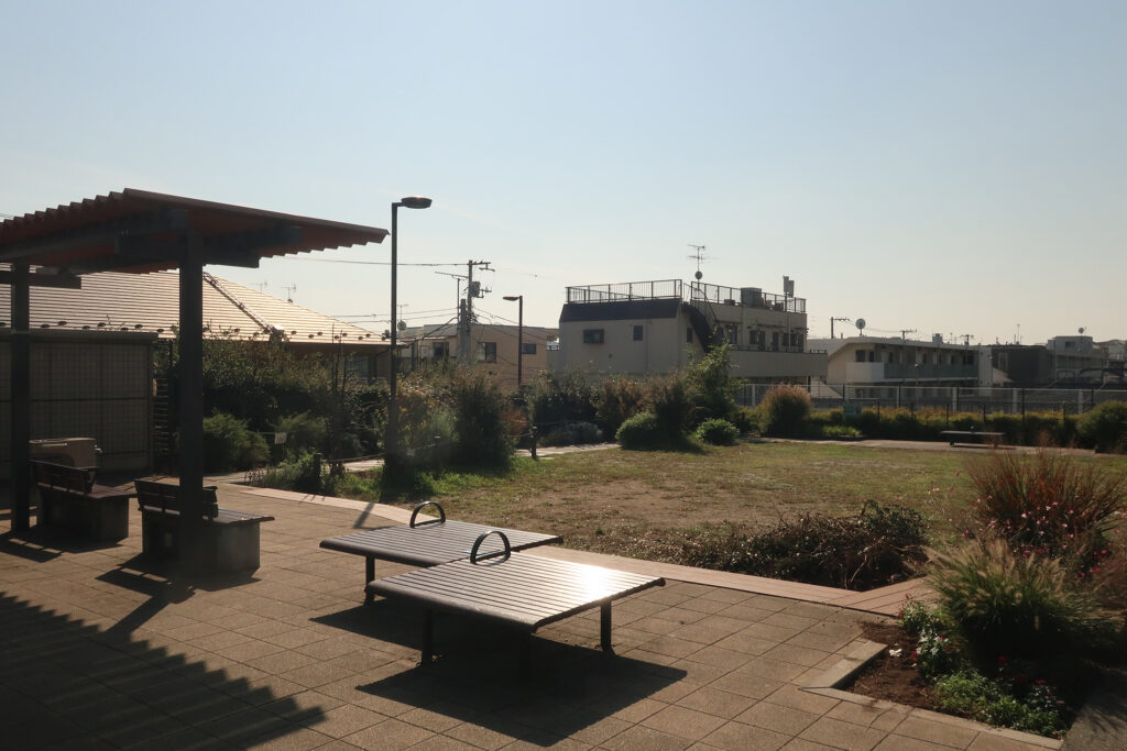 遊歩道が鎌倉通りと交叉する手前には「シモキタ雨庭広場」がある。