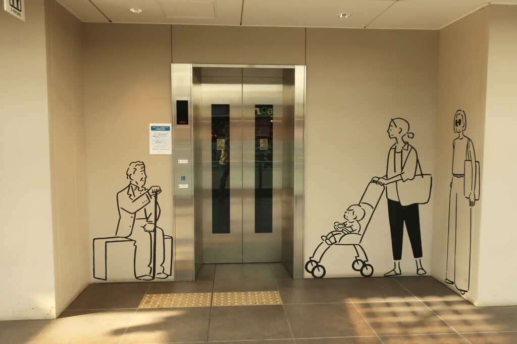 小田急線の「下北沢駅」ホームの上に出来た商業施設「シモキタエキウエ」。これも「下北線路街」の一施設である。飲食店や生活雑貨や花卉を売る店などがある。壁や柱には、馬場雄のイラストが描かれてゐて、愉しい。
