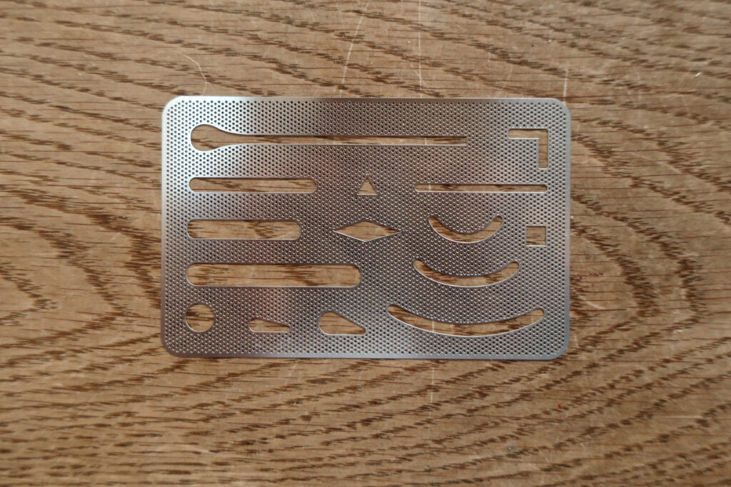 そこで、磨り減つてゐない尻の方の角を使つて消したり、磨り減つた部分をカッターで切り落として出来た新しい角の部分を使つたり(勿論もつたいないので切り落とした方の新しい角も使ふ)、色々と工夫をしたものだ。「字消し板(字消しプレート)」を使ふといふ方法もあるけれど、できれば手軽な方が好い。(「字消し板」とは、ステンレスなどでできた様々な形の穴が開いた薄い板で、文字や線などを消しゴムで消す際に、消す必要の無い部分を一緒に消してしまふことを防ぐための道具。下の写真は、小生の字消し板で、メーカー名は無いがSTAEDLER製だと思ふ。)