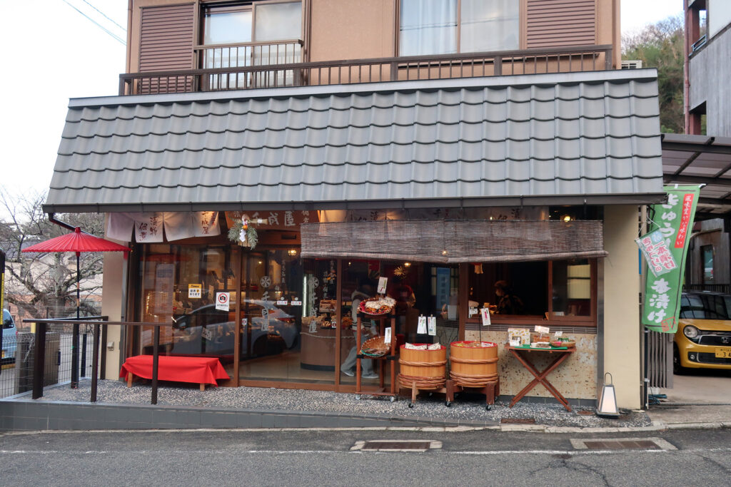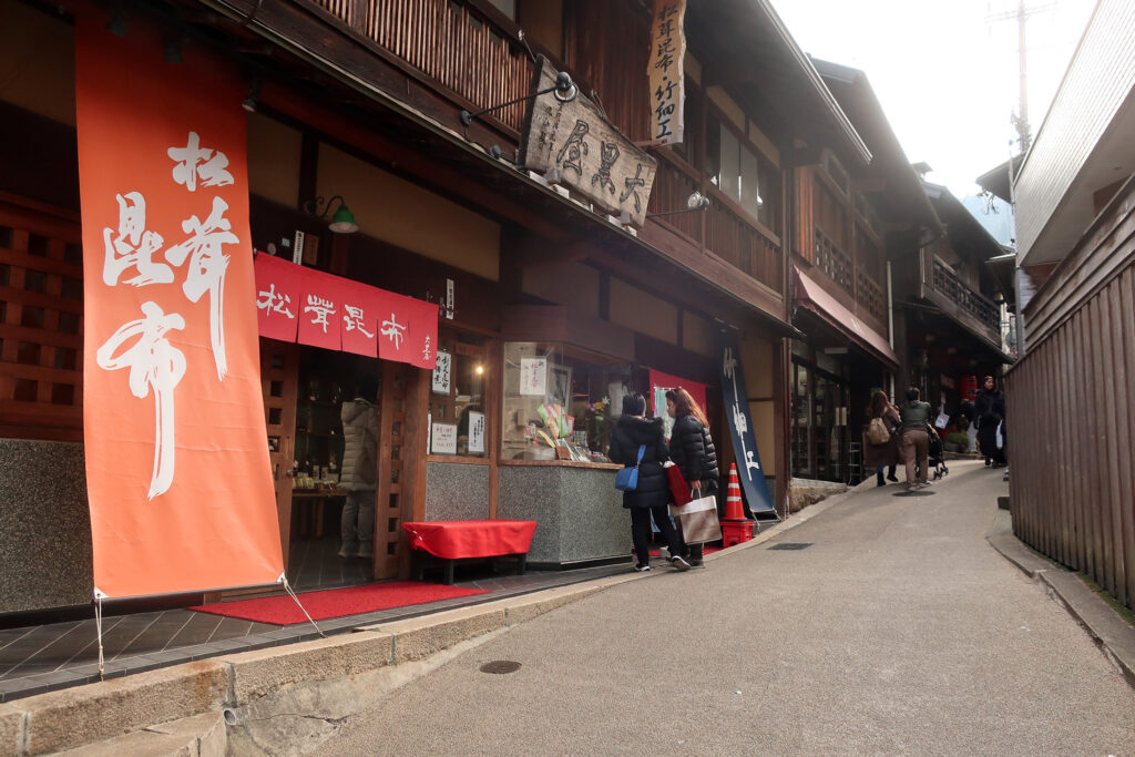 温泉街の入口「太閤橋」の袂にレトロな建物の土産物屋「𠮷高屋」と老舗の漬物屋「千成屋」がある。