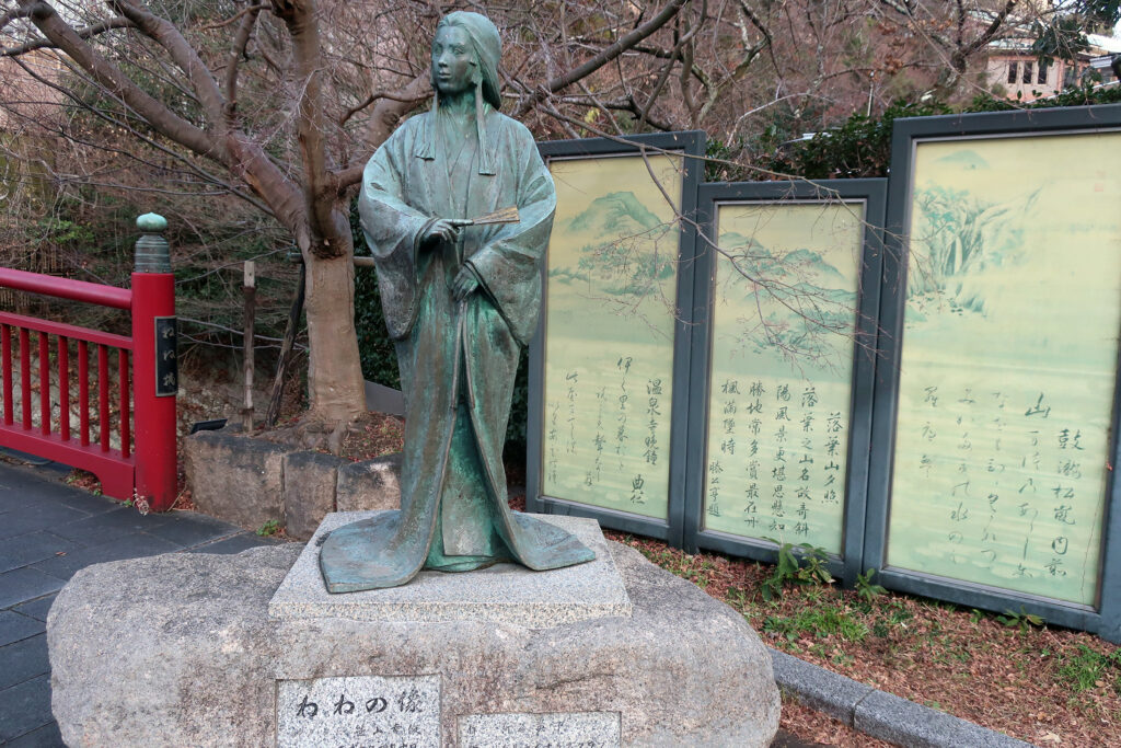 「親水広場」を上流に向かつて歩くと「ねね橋」があり、その袂に「ねねの像」がある。(ねねは、秀吉の正室。)