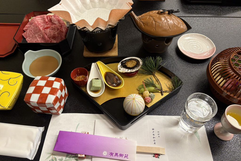 夕食は、「季節の和会席」。神戸牛のしやぶしやぶをメインに、旬の食材を活かした料理が並ぶ。神戸牛は、柔らかく脂肪に甘味もあり、美味。地酒も少しばかり飲む。