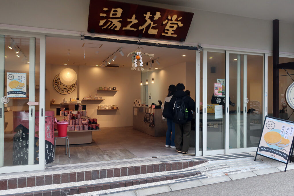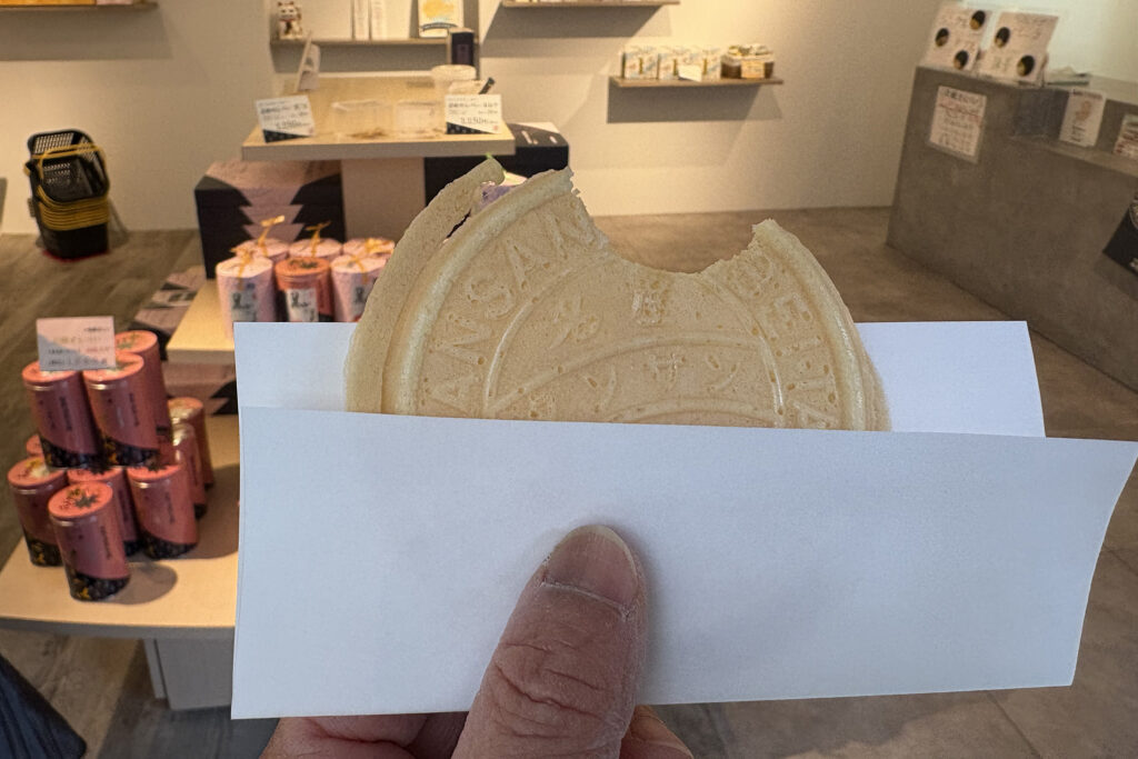 「金の湯」の角を左に曲がると「湯之花堂」がある。ここでは、焼型から剝がしたての熱々で柔らかい〝生〟炭酸煎餅が食べられる。ただし、すぐに堅くなつてしまふので、柔らかい状態で食べられる賞味期限は5秒ださうだ。小生は、片手に iPhone を持つて写真を撮らうとしてゐたら、もう堅くなつてしまつてゐた。…残念。