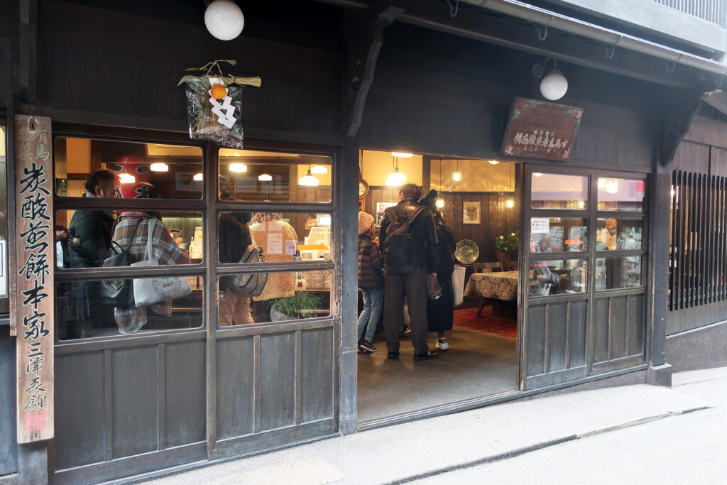 「三津森本舗」は、名物炭酸煎餅の店。創業者の三津森繁松が明治末期に製造・販売したのが炭酸煎餅の初まりださうだ。(帰りに焼きたての炭酸煎餅を1枚試食させてもらつて、妻は知人への土産に炭酸煎餅を買つた。)
