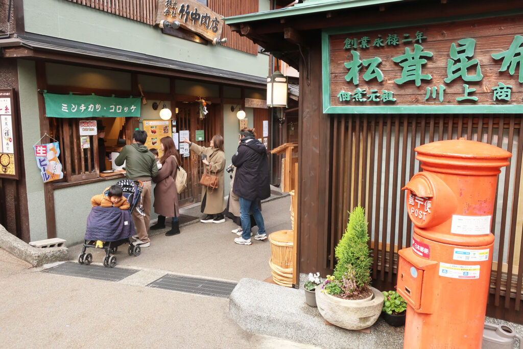 「川上商店」の向かひの「竹中肉店」では、神戸牛を使つたミンチカツやコロッケなどが手軽に食べられる。