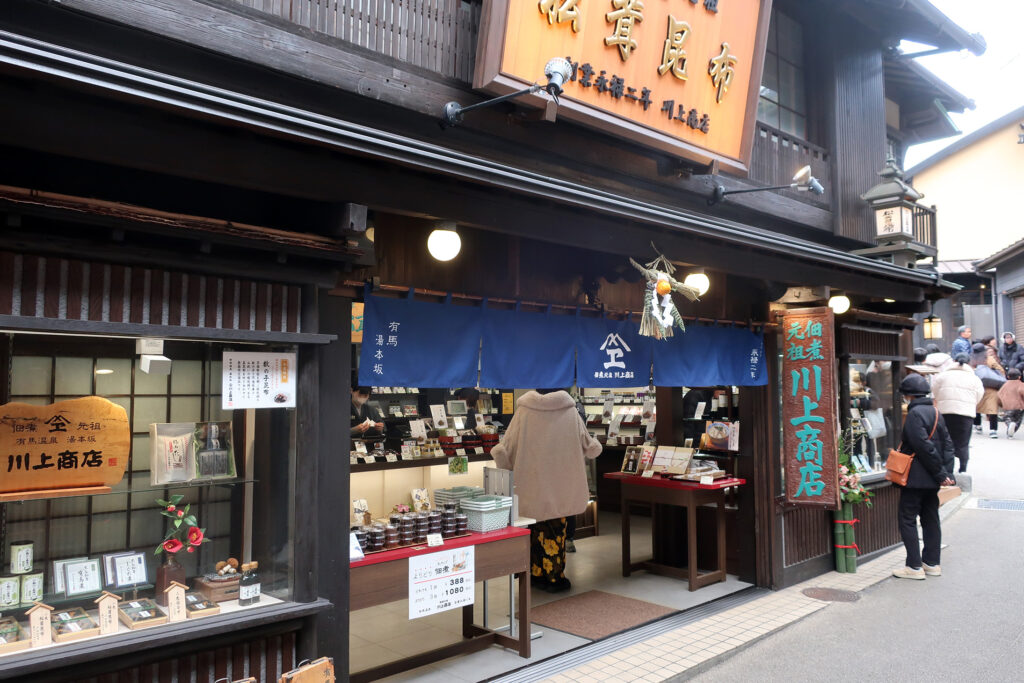 「川上商店」は、室町時代後期創業の佃煮の老舗。名物の松茸昆布の他、有馬山椒を使つた佃煮などを売る。