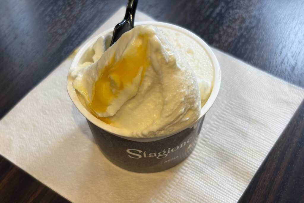路地を引き返し、湯本坂に戻るとすぐにジェラートの名店(国際大会で入賞したさうだ)「arima jelateria Stagione」がある。定番の「六甲プレミアムミルク」に「塩マスカルポーネきんかん香る甘酒仕立て」を加へたものを食す。