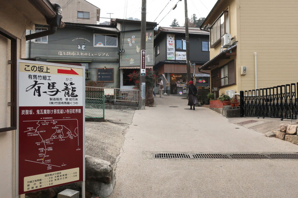 「林渓寺」の手前を右に折れて坂道を登ると、有馬竹細工の「有馬籠 本店」がある。