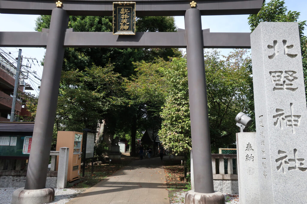 「新井天神 北野神社」は、菅原道真公と食物を司る保食神(うけもちのかみ)の二柱を祀つてゐるさうだ。境内には「新井」といふ地名の由来になつた井戸があり、現在でも使用されてゐるとのこと。