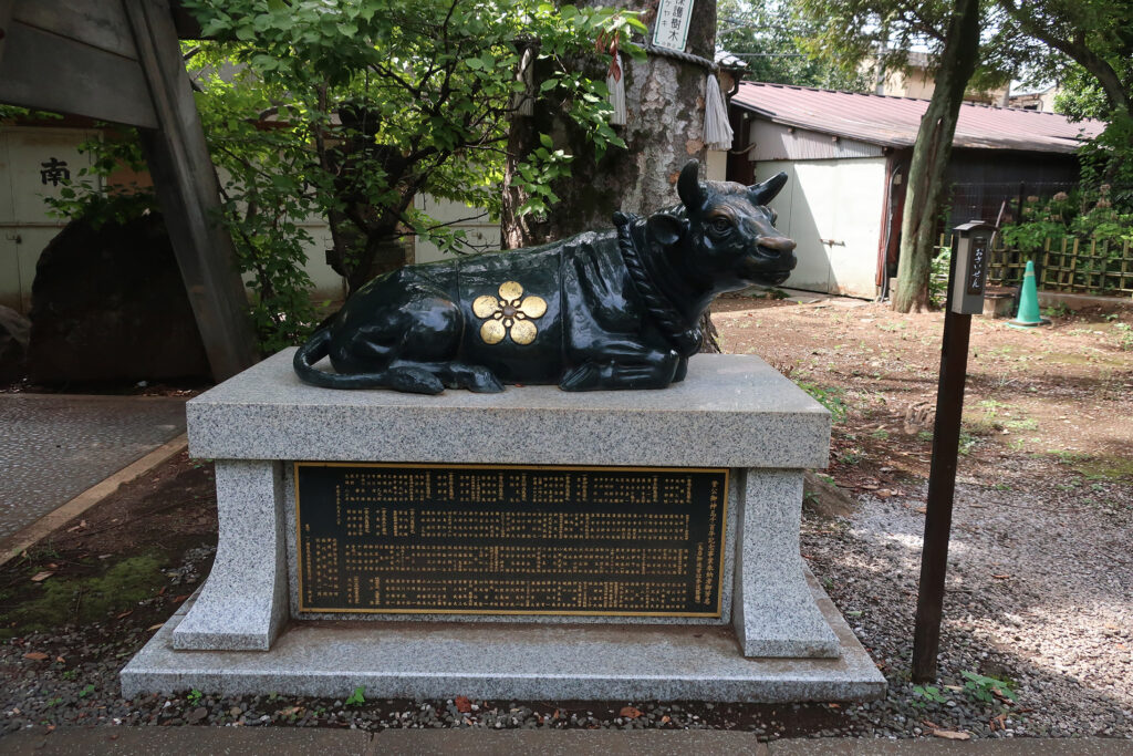 菅原道真公を祭神とする神社では牛が聖獣とされ、境内に牛の像が安置されてゐるのが通例である。「新井天神 北野神社」の境内にも「撫で牛」が置かれてゐる。(「撫で牛」とは、自分の身体の病んだ部分や具合の悪い部分を撫でた後に、その牛の身体の同じ箇所を撫でると、悪い所が 牛に移つて病気が治るといふ俗信に基づくもの。)