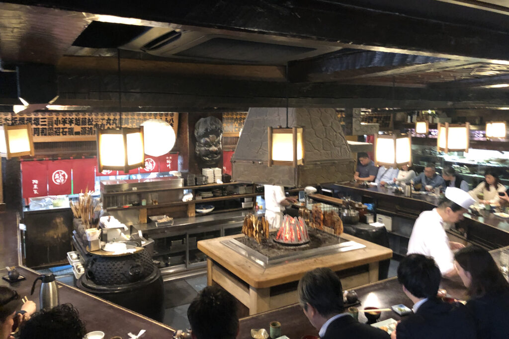 店内(1階)は、大きな囲炉裏を〝コの字形〟に囲むやうにカウンターがある。(今日撮つた写真は店員と客の顔がはつきり写つてしまつてゐたので、下の写真は去年撮つたもの。店内が暗いためブレてゐるが、かへつて都合好し。容赦されたし。)