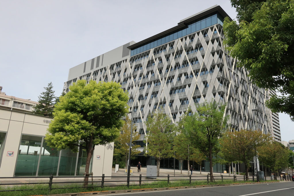 「平和公園通り」が「早稲田通り」にぶつかつた先にある菱形模様の壁の特徴的な建物が「中野市役所」である。「中野市役所」の隣には「四季の森公園」、道路を挟んだ南側には「中野セントラルパーク」がある。