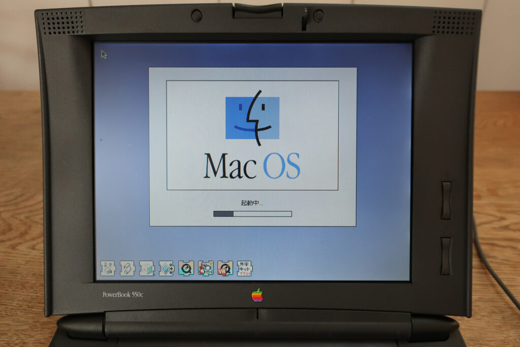 下の写真は「PowerBook 550c」の起動画面だが、システムは「漢字Talk7.5」で、起動時にシステムに組み込まれる機能拡張のアイコンが表示された。1番右のアイコンには「外字キットTT2.1」といふ文字が見えるが、これは外字(JIS第1水準・第2水準に無い漢字や記号)を使用するためのものである。国語では、必要とする漢字の数が多く、標準の文字種では不十分で、少しでも多くの漢字が使ひたくて、外字を(人名用外字も)利用した。(今は、標準で「鷗」の字が使用できるが、この当時は「森鷗外」が「森鴎外」になつてしまふと話題になつた。それはまだ些細なことだつたが…。)