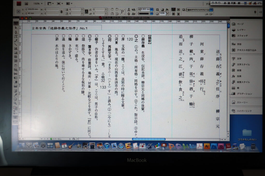 下の写真は、「InDesign」で作成した漢文の教材(ノート)である。B4版縦2段組だが、画面に見えてゐるのは上段で原文と語釈、(見えないが)下段は書き下し文と現代語訳になつてゐる。(生徒用には、重要語は項目だけを示し、語釈の部分は自分で書き込ませるやうにした。書き下し文は自分で書かせ、現代語訳は穴埋め式にした。)返り点の類は、DynaFont「GaijiEditor」で作成した外字である。このレベルの教材は、「MSWard」や「Pages」では作れない(と思ふ)。