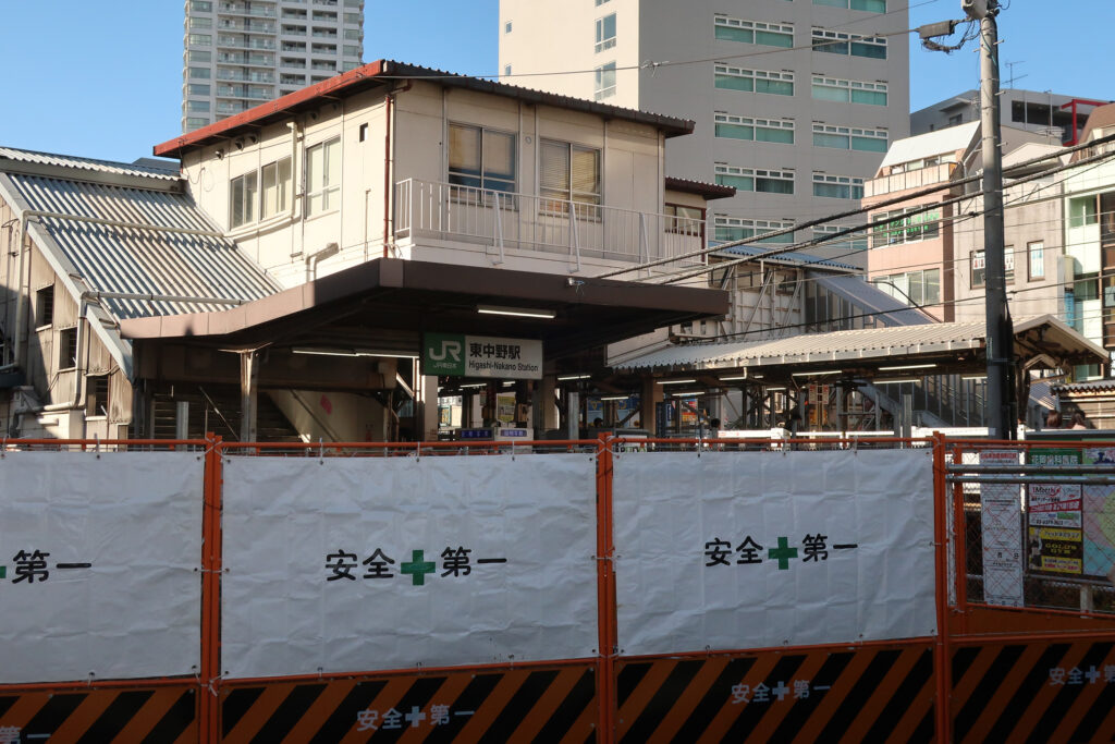 JR総武線「東中野駅」東口。「東中野駅」から「立川駅」までは長い一直線である。駅前は工事中だつた。再開発が計画されてゐるらしい。