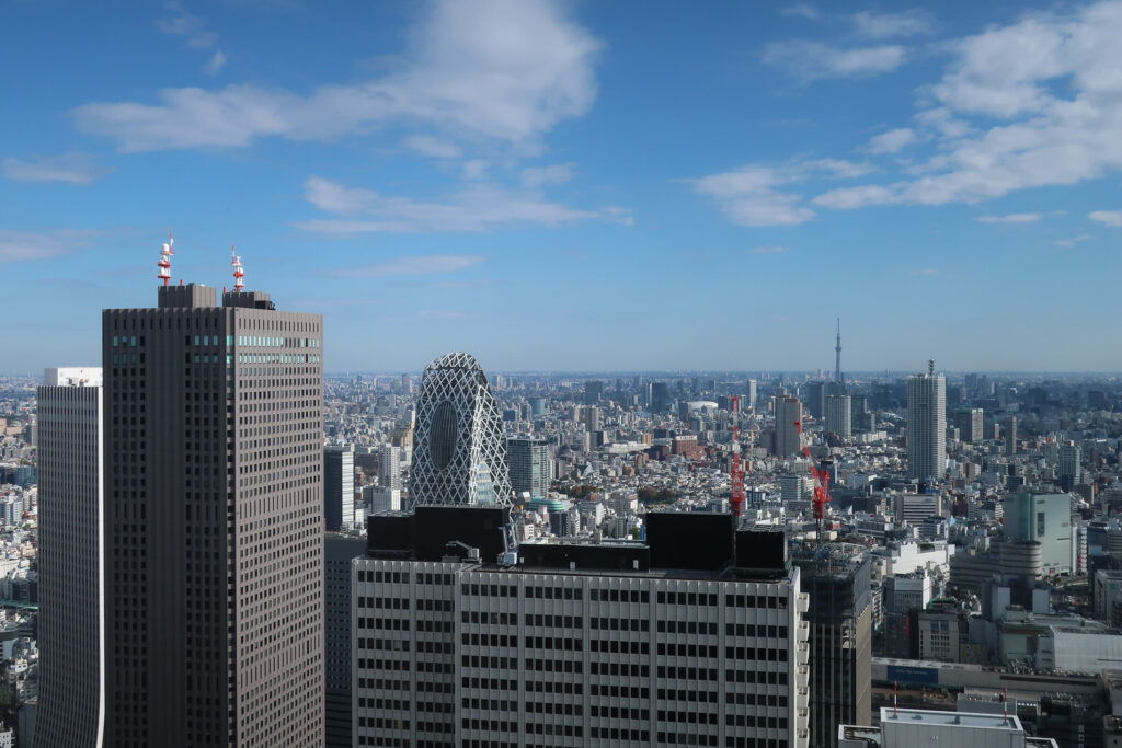 2階デッキから眺めた「モード学園コクーンタワー」や「新宿エルタワー」などの高層ビル群。
