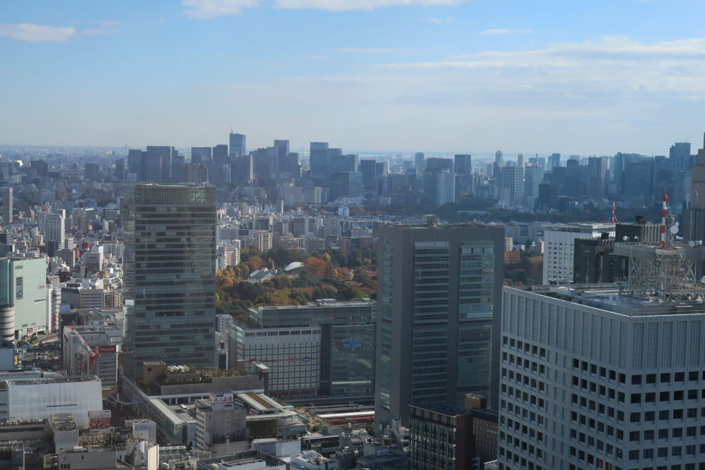 南東の方角。「新宿高島屋」の向かうに「新宿御苑」の紅葉した木々が見える。「東京タワー」は、ビルの陰で見えない。