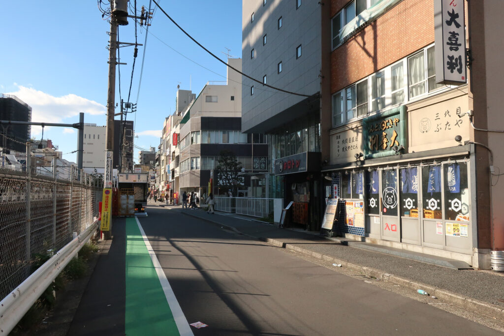 東口改札前の自由通路を通り、北側へ。線路沿の道の写真。ちよつとした商店街になつてゐる。