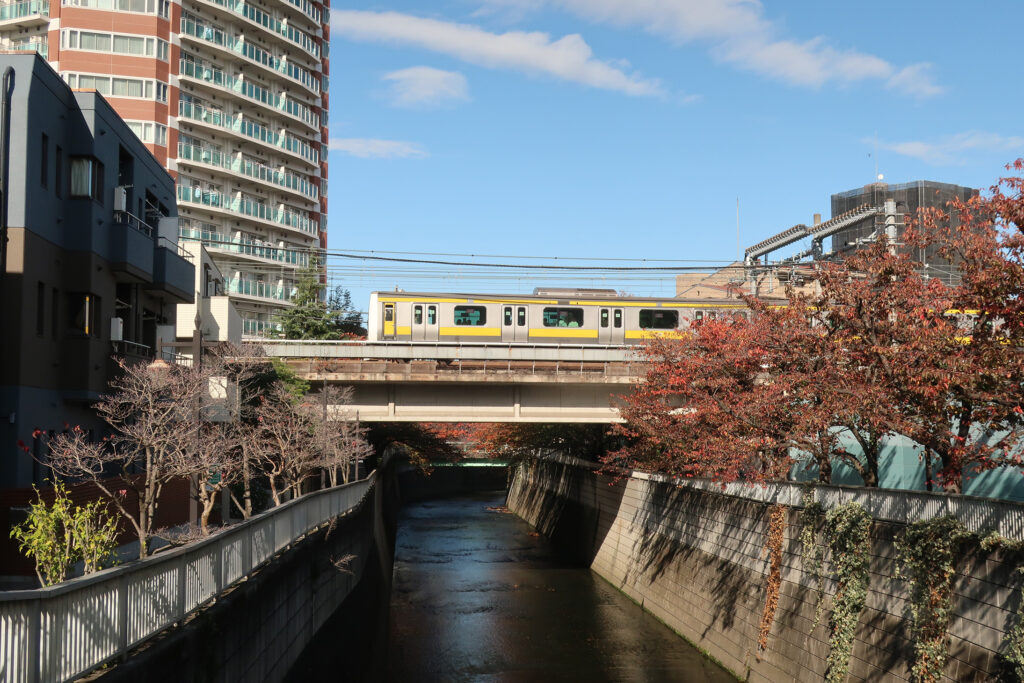「万亀橋」から鉄橋を通過する総武線の車輌の写真を撮る。