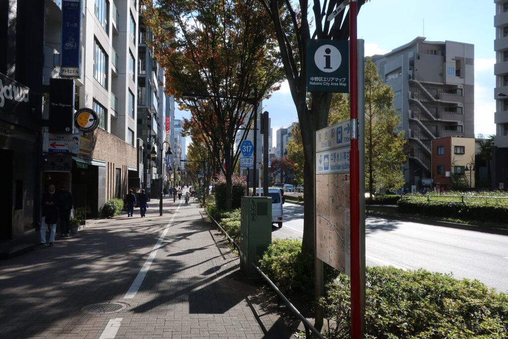 西口駅前に廻る。西口は、山手通りに接してゐる。駅前から北西に延びる「東中野ギンザ通り(商店街)」がある。
