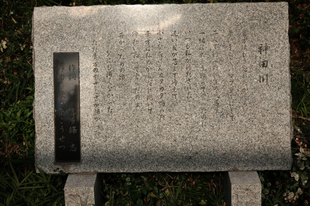 「末広橋」の袂には、フォークグループ「かぐや姫」の歌つた「神田川」の歌碑(作詞は喜多條忠)がある。懐かしい!(ソロになつた南こうせつのコンサートに1度行つたことがある。)