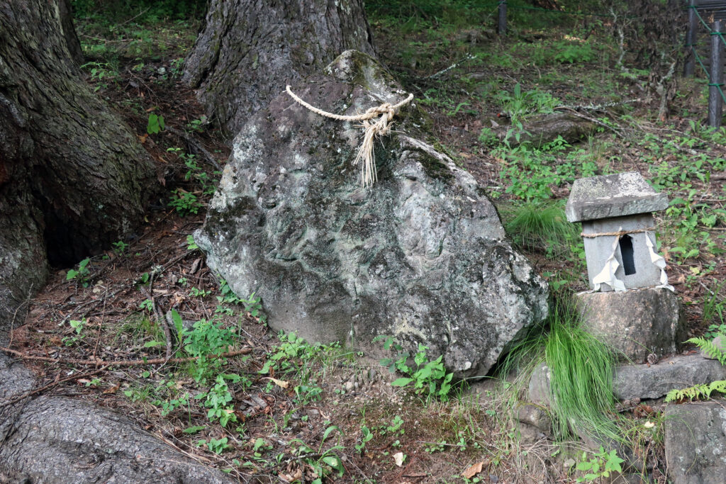 南側の公園の坂を降りると、「尖石遺跡」の名称の元になつた「尖石」がある。三角錐状の大きな石で、右肩の樋状の凹みは磨り痕から人工のものと思はれ、縄文時代に磨製石斧を制作した際に、共同砥石に使用されたものではないかと言はれてゐる。(諸説あり。)