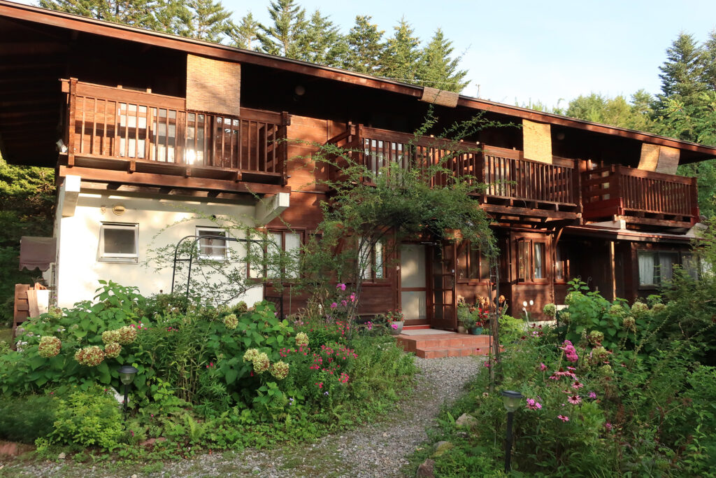 宿泊は、三井の森のペンション「けさらんぱさらん」。閑静な別荘地にあり、落ち着いた校倉造りの建物と宿根草のナチュラルガーデンが、懐かしい気持にさせる。