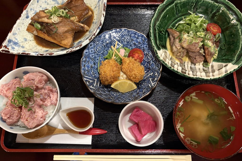 海無し県の長野だが、漁港から直接食材を仕入れてゐるとのことなので、小生は「まぐろづくし定食」を注文する。一見してボリュームがあるが、カマの煮付け(煮物)・マグロメンチ(揚げ物)・ホホ肉のステーキ(焼き物)・ネギトロ丼(生)とバリュエーションに富んでゐて美味しく、飽きずに食すことができた。