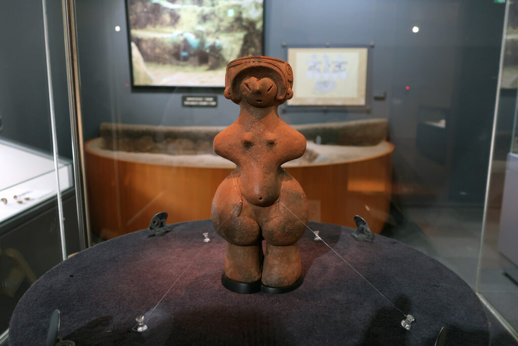 下の写真は、順に「仮面の土偶」「縄文の女神」で、どちらも国宝。他にも国宝の土器などが展示されてゐた。