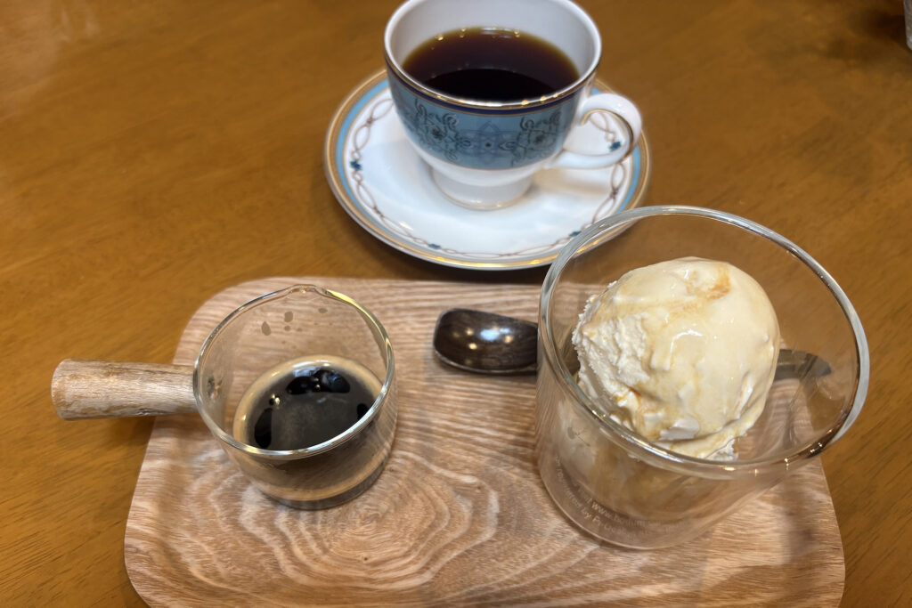小生は、昼食に「ナポリタン」を食し(空腹で写真を撮り忘れた)、珈琲は「モカゲイシャ」を喫す。フローラルな甘酸つぱい香りが、快い。デザートに「アフォガート」(バニラアイスクリームにエスプレッソを掛けたもの)も注文する。
