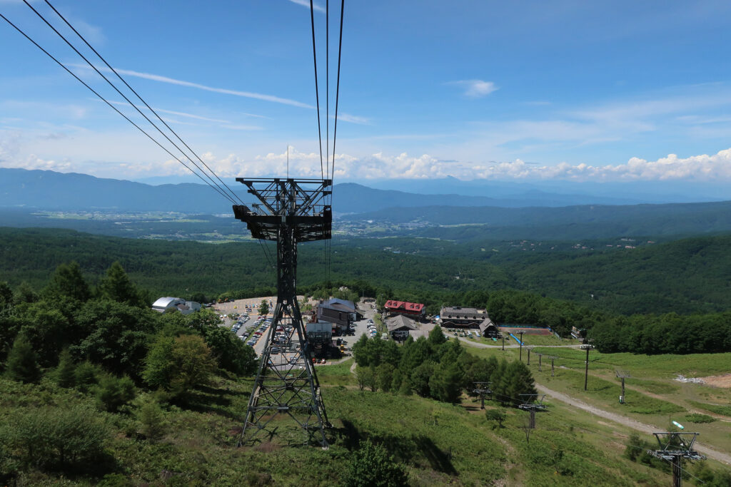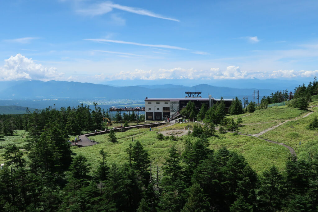 「坪庭自然園」の岩山の上から「山頂駅」を望む。「山頂駅」の2階には、カフェテリア「スカイレストラン」の先に「展望台 スカイアイ2237」があり、北・中央・南の「日本三大アルプス」が一望できる。