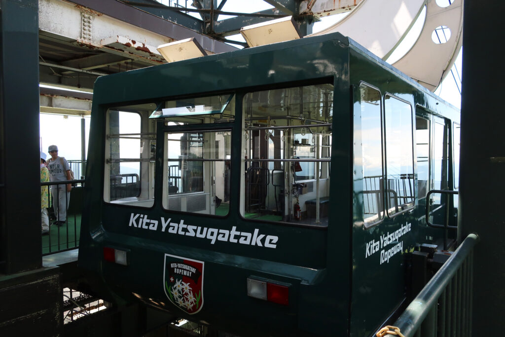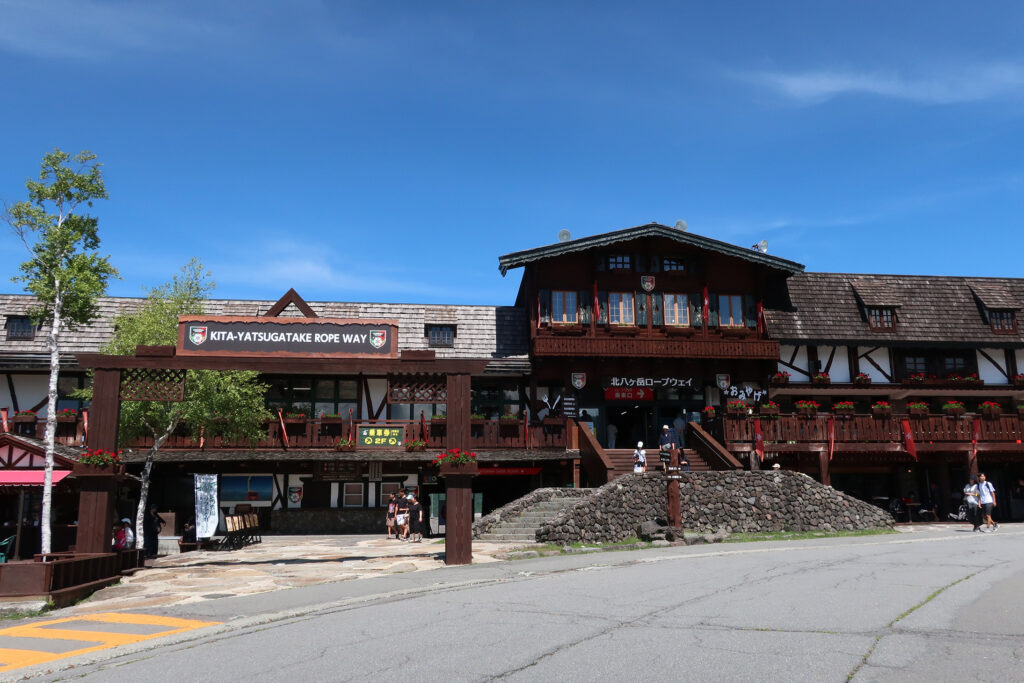 「北八ヶ岳ロープウェイ」に乗る。「山麓駅」の駅舎は、スイス風の造りである。「山麓駅」の標高は1771mで、標高2237mの「山頂駅」まで全長2215m・高低差466mを約7分で昇つてゆく。