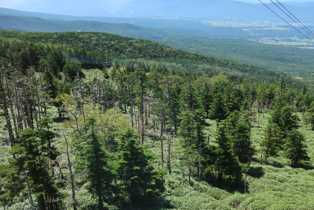 ロープウェイの下の斜面には、縞枯れした樹木が見える。(「縞枯れ」は、亜高山帯の針葉樹である白檜曾(シラビソ)や大白檜曾(オオシラビソ)の優占林に限つて出現する現象だといふ。これらの樹林帯の一部が帯状に枯れると白い縞模様ができるので、この名がある。)