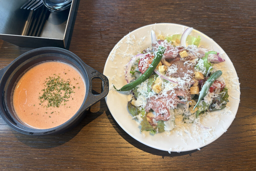 小生は、「諏訪味豚のスイートジンジャーポーク」を注文。スープ(この日はトマトのポタージュ)・サラダ(信州和牛のローストビーフが乗つてゐる)・ライス(またはパン)・飲み物(桃ジュースにした)付き。